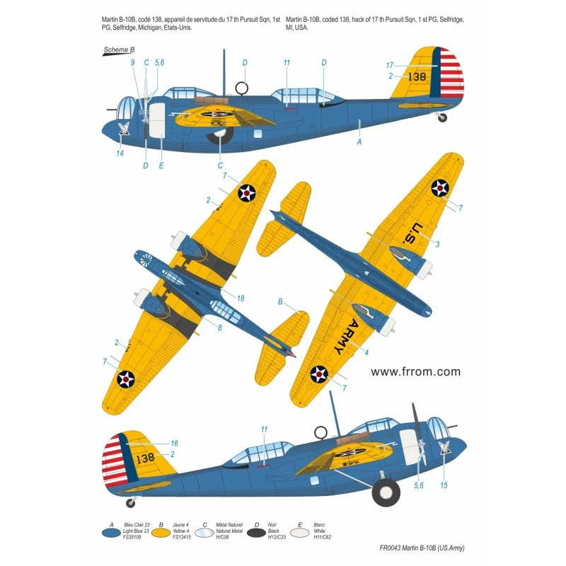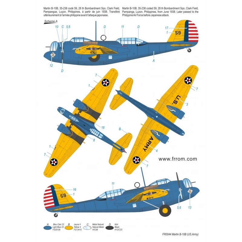 Martin B-10B in US Service. History : first aircraft in USAAF service with all metal construction, retracting landing gear, was faster than the fighters when introduced in service. Decals for 2 aircraft, B-10B 35-238 coded 59, 28 th BS, Clark Field, Philippines, June 1938, USAAF, B-10B coded 138, hack of 17th Pursuit Sqn, 1 st PG, Selfridge, MI, USA.