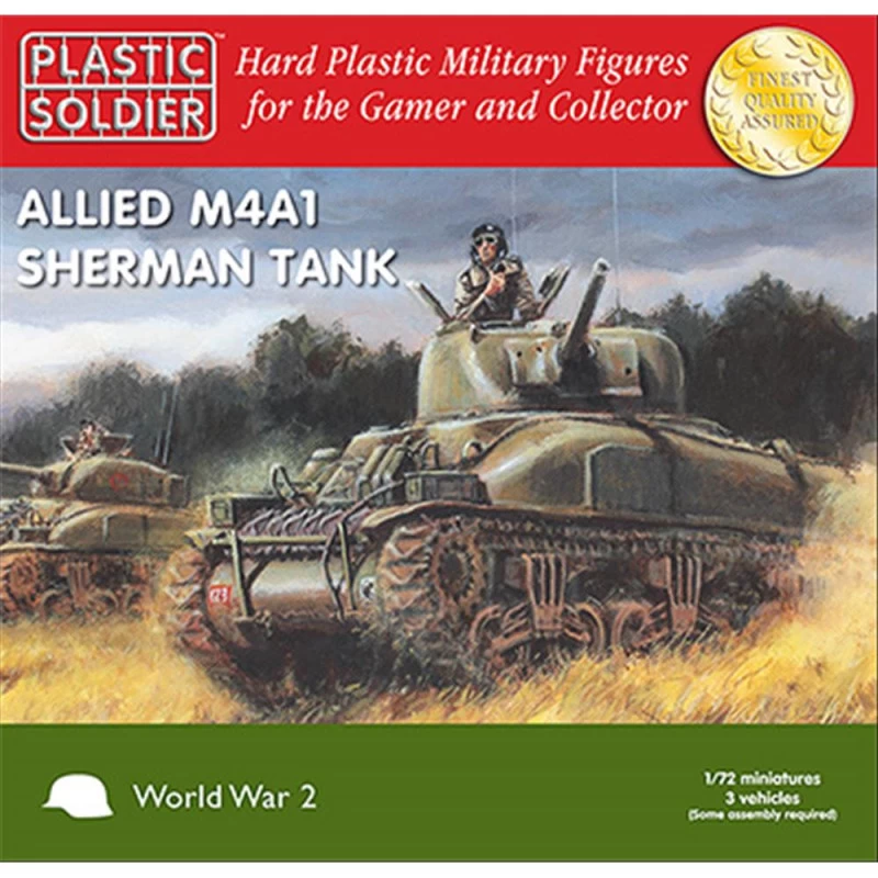 3 x 1/72nd Easy Assembly Sherman M4A1 75mm Tanks with British Commander figures and sand skirt options. Suitable for British and Commonwealth forces from El Alamein in 1942 onwardsclass”descriptionBox”>