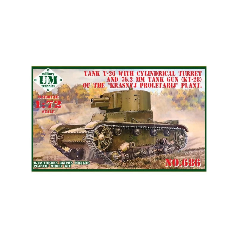 T-26 tank with cylindrical turret and 76.2mm tunk gun (KT-28) with plastic tracksThis set includes:sprues with partsplastic tracksphoto-etched partsscheme for painting modeldetailed instruction