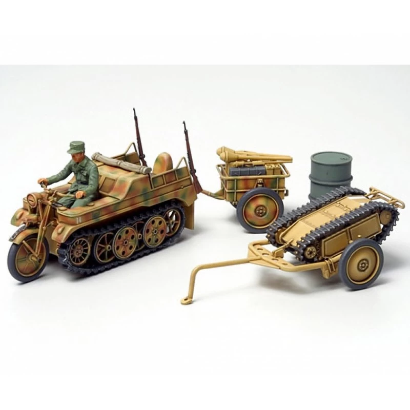 This is a fabulous complete display kit featuring Kettenkfraftrad with an infantry cart, a demolition vehicle and many other great accessories on a tiny 1/48 scale.