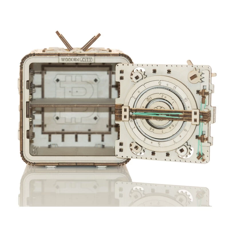 The Wooden City magic clock has two dials, one for hours and one for minutes. It is adorned with pretty fancy engravings and has rotating gears that support the rhythm of the pendulum. This clock makes it possible to observe the entire most basic watchmaking mechanism. The movement of the clock lasts half an hour.